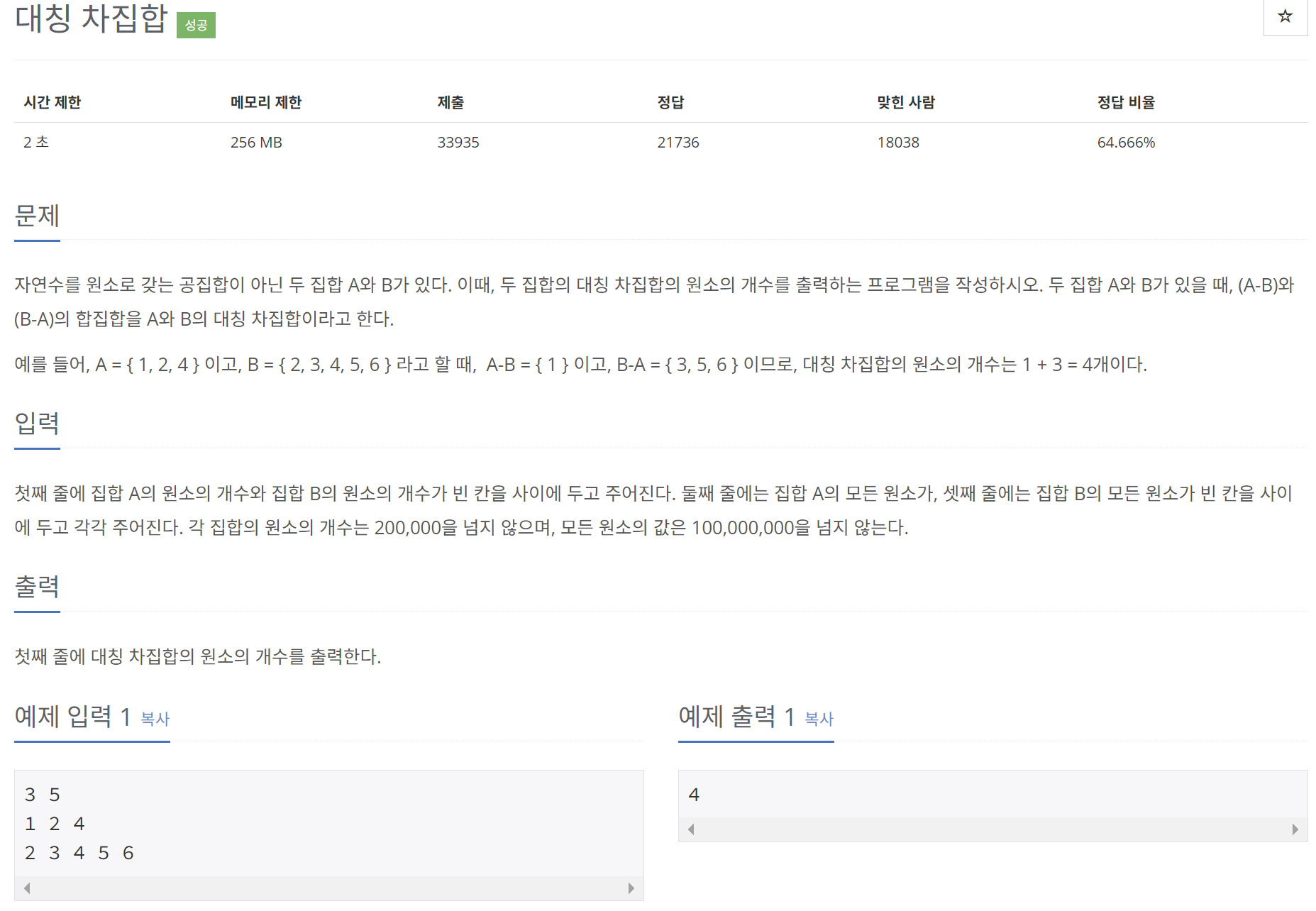 대칭 차집합은 (A의 원소 개수) + (B의 원소 개수) - 2*(A, B 교집합의 원소 개수) 로 구할 수 있으므로 이를 이용해 풀이한다. A와 B 교집합의 원소 개수를 구하기 위해 이진 탐색을 사용했다.