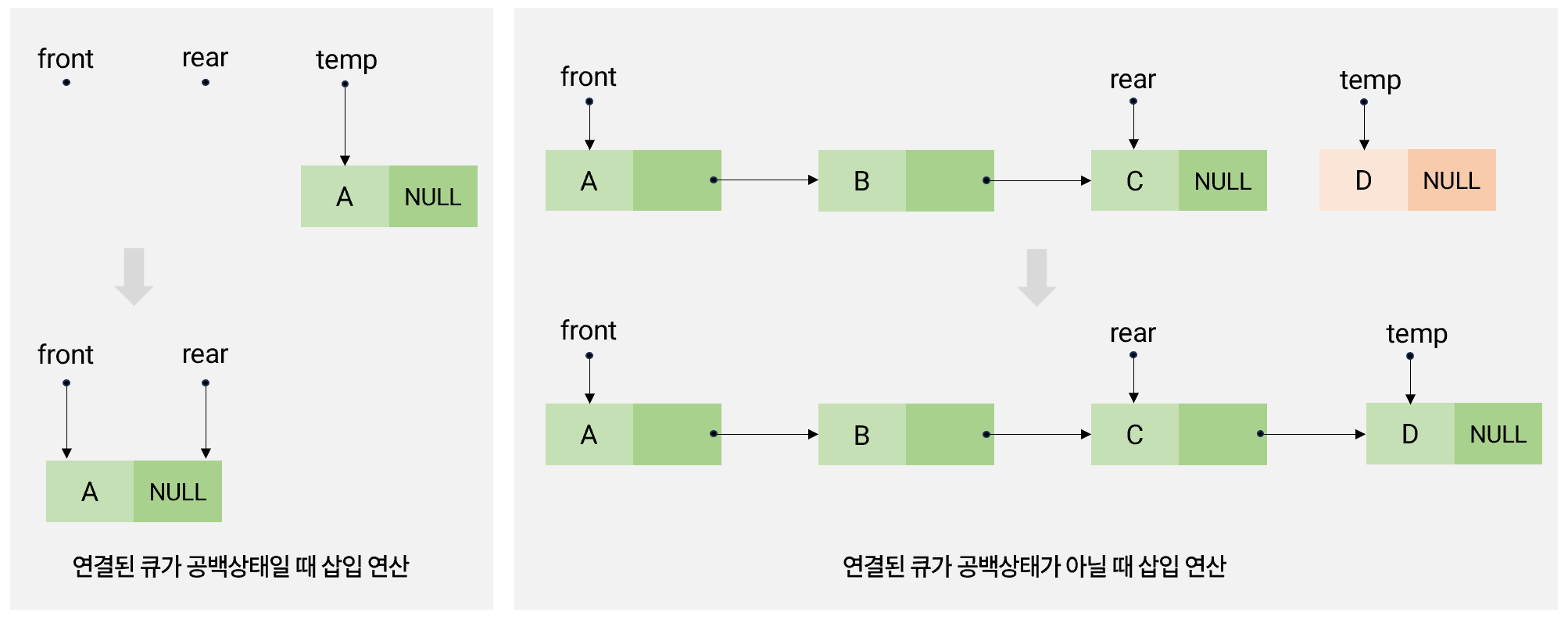 - 큐가 공백 상태이면(front=rear=NULL) front와 rear 모두 새로운 노드를 가리키게 해야 함