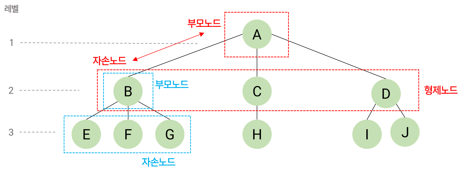 노드들 간에 부모, 형제, 조상과 후손 관계 존재