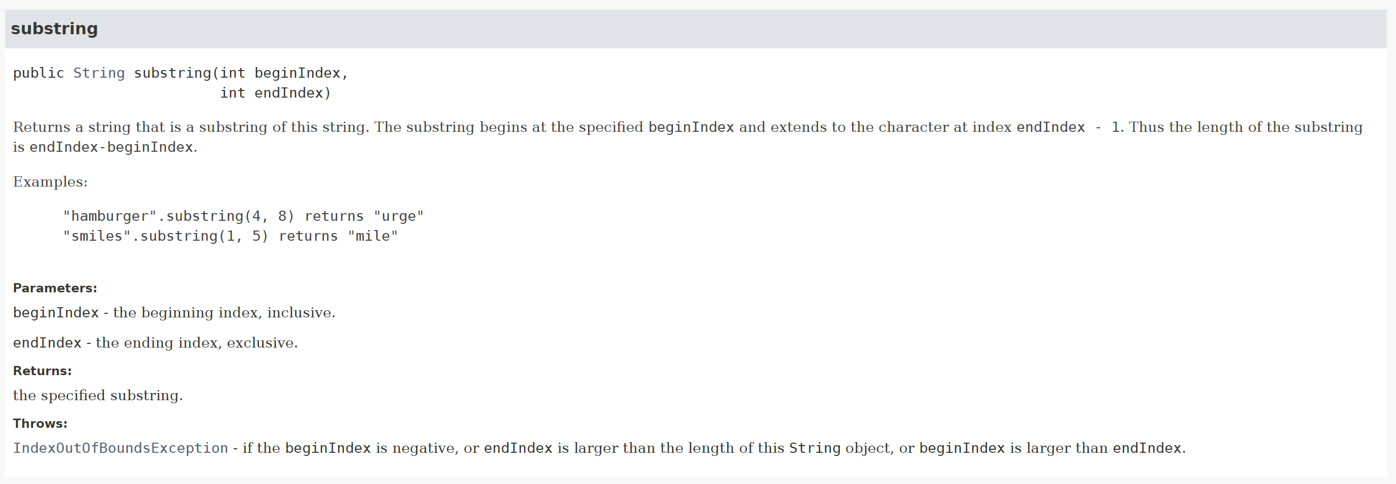 시작 인덱스와 끝 인덱스를 입력하면 해당하는 범위의 부분 문자열을 반환하므로, 이중 for문을 이용해 인덱스를 구한다. beginIndex 이상, endIndex 미만의 범위임에 주의해야 한다.