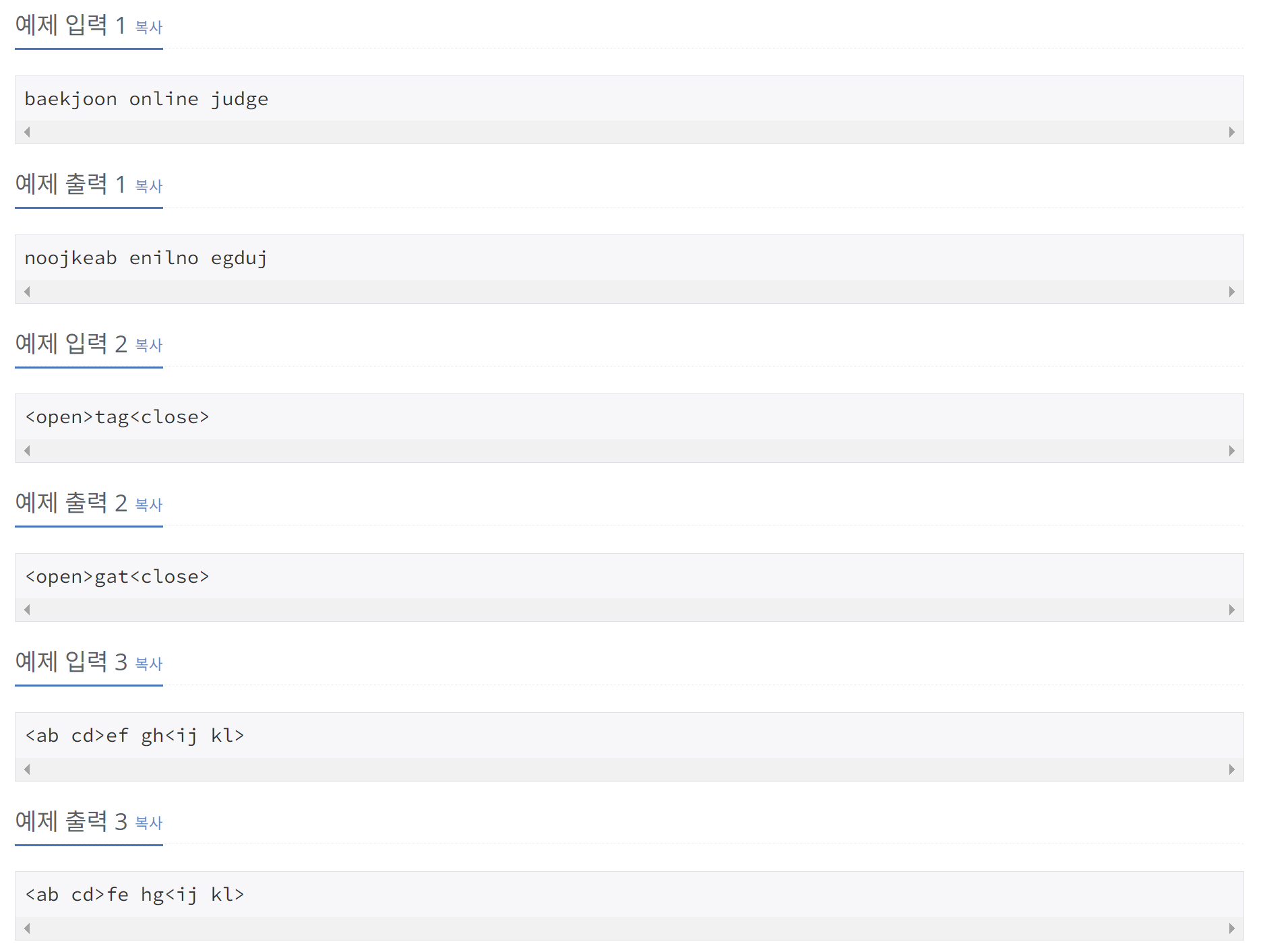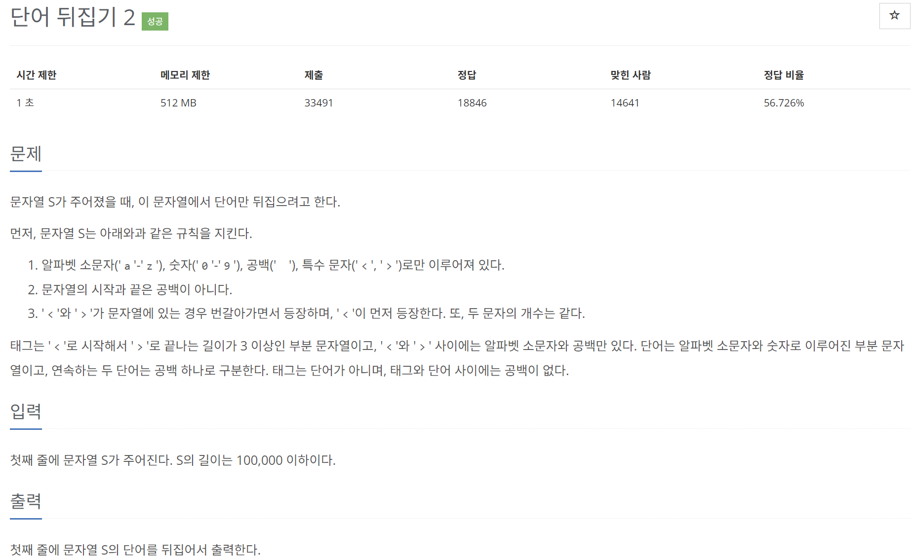 ch가 괄호 바깥에 있어 스택을 이용해 한 번 뒤집은 후 출력해야 한다. 입력된 문자열은 공백을 기준으로 분리되므로 ch가 공백일 때와 아닐 때를 다시 구분해야 한다. ch가 공백일 때는 새로운 단어를 처리하기 전에 이전 단어를(뒤집은 단어) 출력해야 하며, while문을 사용해 스택이 공백 상태가 될 때까지 스택의 요소들을 모두 pop한다. 마지막에 공백을 추가해야 함에 주의하자.