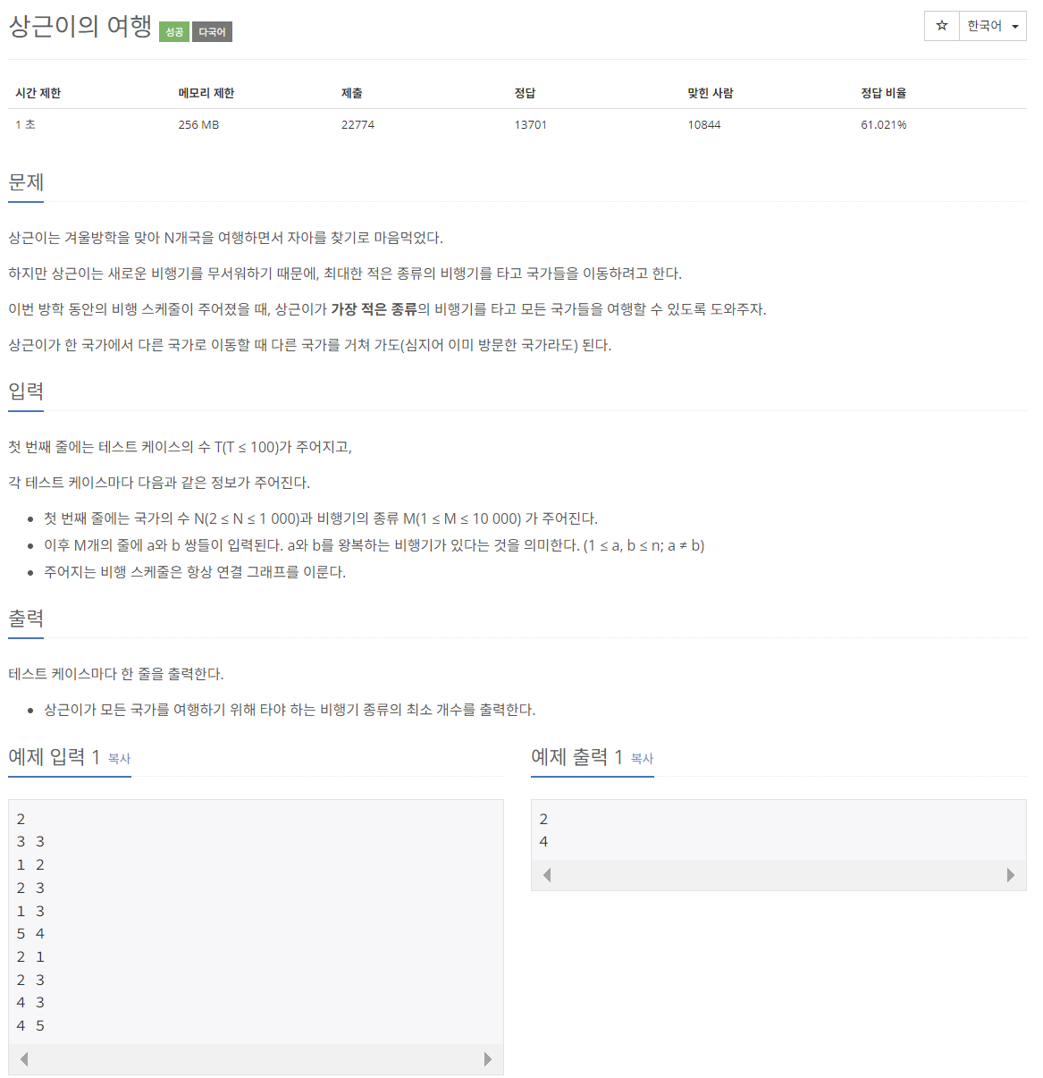 상근이는 국가를 방문하고자 하므로, 각 국가를 정점으로 생각한다면 M이나 a, b 쌍을 고려할 필요 없이 (N-1)을 출력함으로써 풀 수 있는 문제이다.