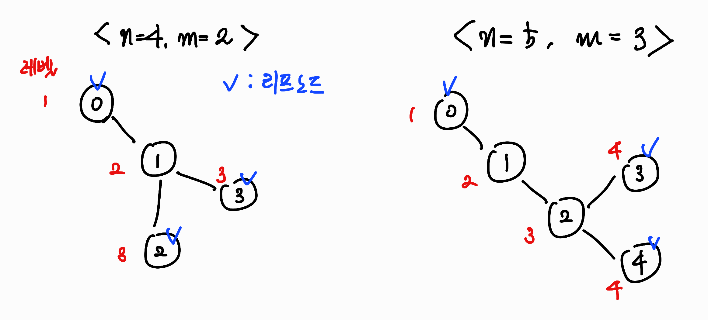 정점 0의 레벨을 1이라 하자. 정점 0은 무조건 정점 1과만 연결된 리프여야 하고, 최하위 (m-1)개의 정점들은 모두 바로 위 정점과 연결된 리프이므로 레벨 (n-m-1)까지의 정점들은 바로 다음 정점과만 연결된다.