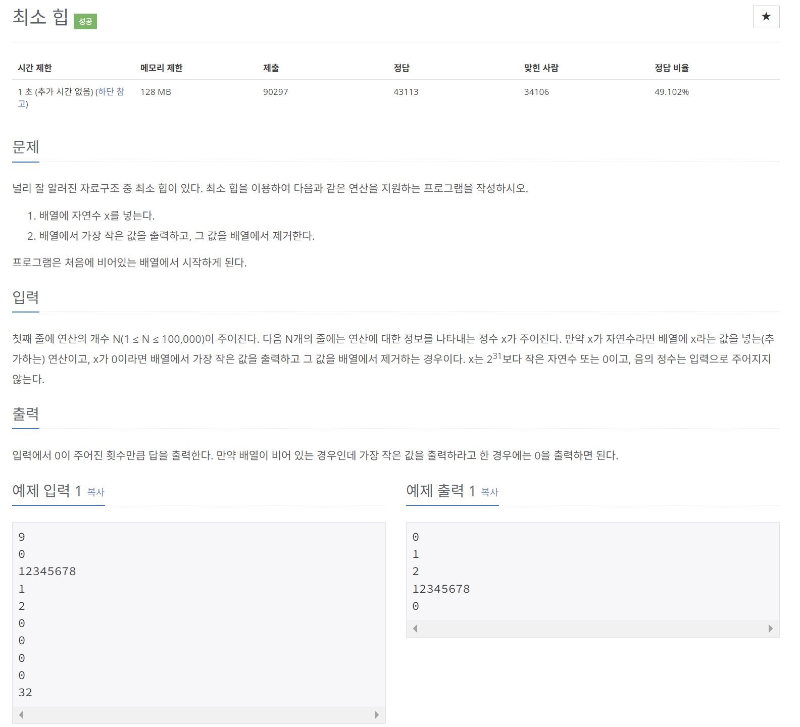 PriorityQueue 객체에서 요소를 poll하면 자동으로 가장 작은 값이 반환되므로, N만큼 반복하며 0이 입력되면 poll하고 아니라면 offer해주기만 하면 끝난다.