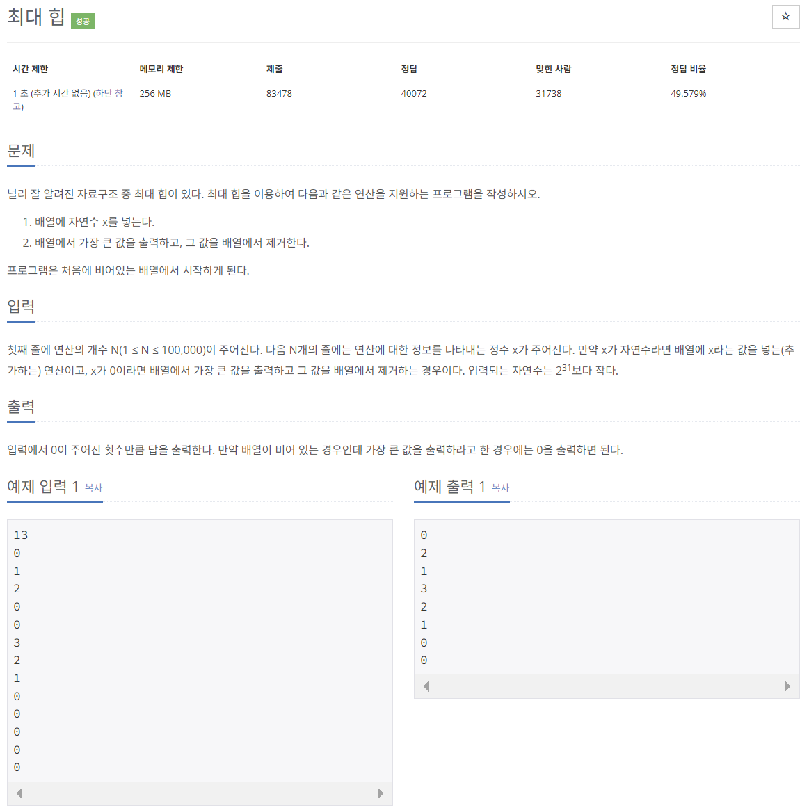 최대 우선순위 큐를 이용하는 문제이다. PriorityQueue 객체 생성 시 내림차순 정렬하는 것을 제외하면 1927번 문제와 풀이 방식이 동일하다.