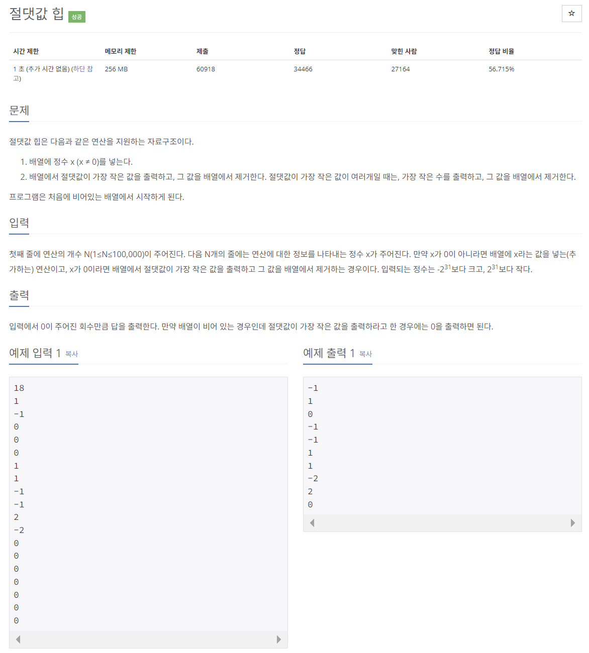 작은 수부터 출력해야 하므로 최소 우선순위 큐로 풀이하되, 절댓값은 같지만 부호가 다를 경우 순서를 조정해야 하므로 Comparator를 수정한다.