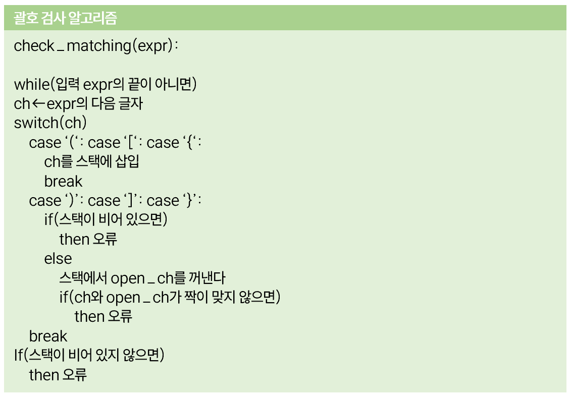문자열에 있는 괄호를 차례대로 조사하며 왼쪽 괄호를 만나면 스택에 삽입하고, 오른쪽 괄호를 만나면 스택에서 맨 위의 괄호를 꺼낸 후 오른쪽 괄호와 짝이 맞는지 검사한다. 이 때, 스택이 비어 있으면 조건 1 또는 조건 2에 위배되고, 괄호의 짝이 맞지 않으면 조건 3에 위배된다. 마지막 괄호까지 조사한 후에도 스택에 괄호가 남아 있으면 조건 1에 위배되므로 오류이다.