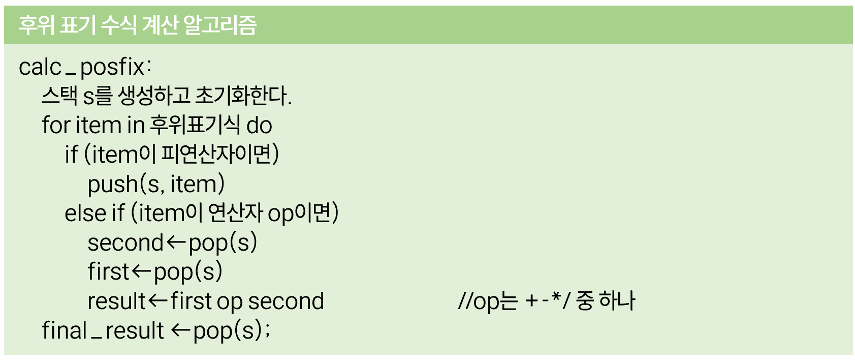 후위 표기 수식을 계산하려면, 수식을 왼쪽에서 오른쪽으로 스캔하여 피연산자이면 스택에 저장하고, 연산자이면 필요한 수만큼의 피연산자를 스택에서 꺼내 연산을 실행한 후 연산의 결과를 다시 스택에 저장한다.