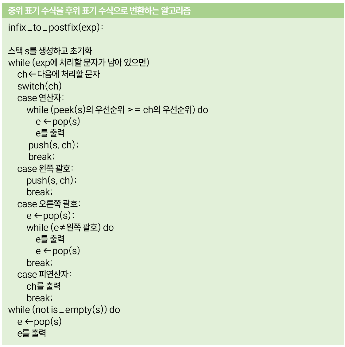 중위 표기 수식을 후위 표기 수식으로 변환하기 위해 입력 수식을 왼쪽에서 오른쪽으로 스캔한다. 피연산자를 만나게 되면 바로 후위 표기 수식에 출력하고, 연산자를 만나면 따로 저장한다. 후위 표기 수식에서는 기본적으로 피연산자들 뒤에 연산자가 나오므로 적절한 위치를 찾을 때까지 출력을 보류해야 하기 때문이다.